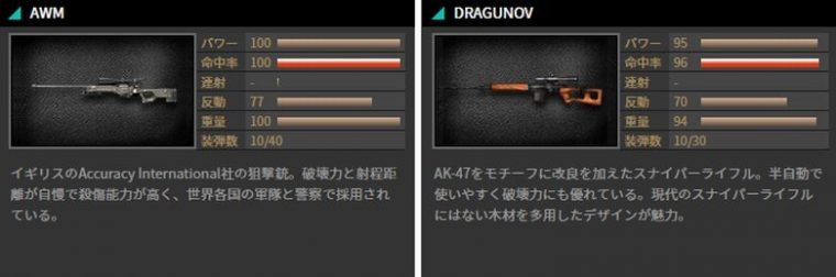 クロスファイアでは「DRAGUNOV」、「AWM」などのスナイパーライフルが登場します。