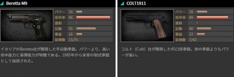 バランスの良い「Beretta M9」、装弾数の多い「GLOCK-18」、357マグナムの「Anaconda」が登場します。